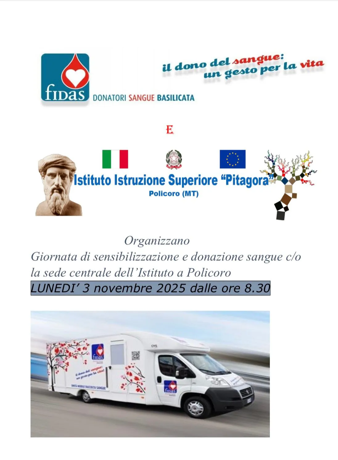 Lunedì 3 novembre 2025, dalle ore 8:30, l’Istituto di Istruzione Superiore “Pitagora” di Policoro ospiterà l’autoemoteca della FIDAS Basilicata per la settima Giornata della Donazione del Sangue, rivolta a studenti maggiorenni, docenti, personale ATA e genitori.